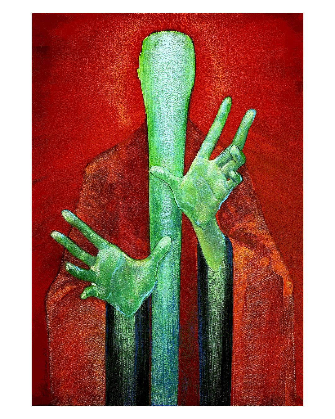 At the heart of Tamara’s presentation is "Red Monk" (100 × 70 cm, 2023; canvas, tempera, acrylic, oil pastel). The work was created intuitively, guided by a felt transmission of energy. Conceived initially in a field of purple with forward-reaching green hands, the painting evolved organically: layers of color and gesture shaped the red kimono and background, while a green center emerged to anchor the figure. Pastel marks soften the surface, articulating the aura of the energy being conveyed.